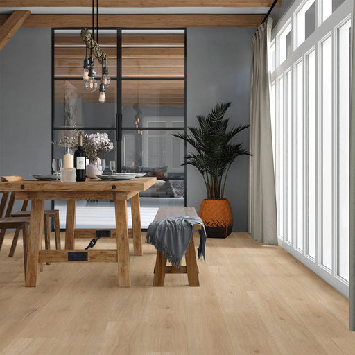Die Vivafloors Eiche 7210 Klick ist ein Vinylboden in Holzoptik mit einer hellen, sanft beigefarbenen Eichenstruktur. Die matte Oberfläche und die ...